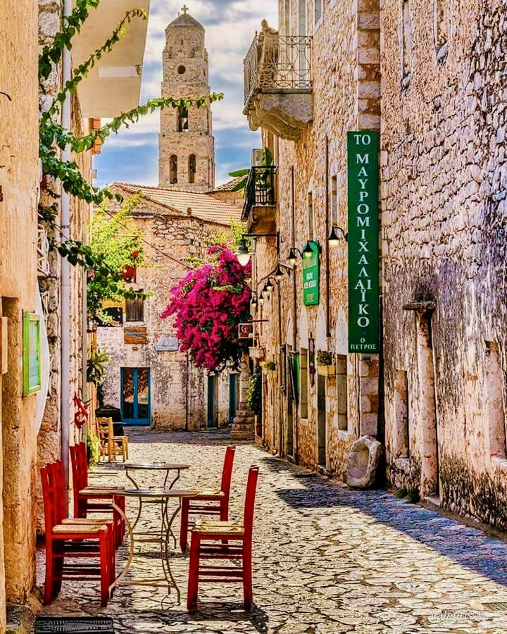 Wander cobbled lanes in Mani’s historic capital. Visit the Church of Taxiarchis with its 6-story bell tower and browse shops selling thyme honey and olive wood crafts.
